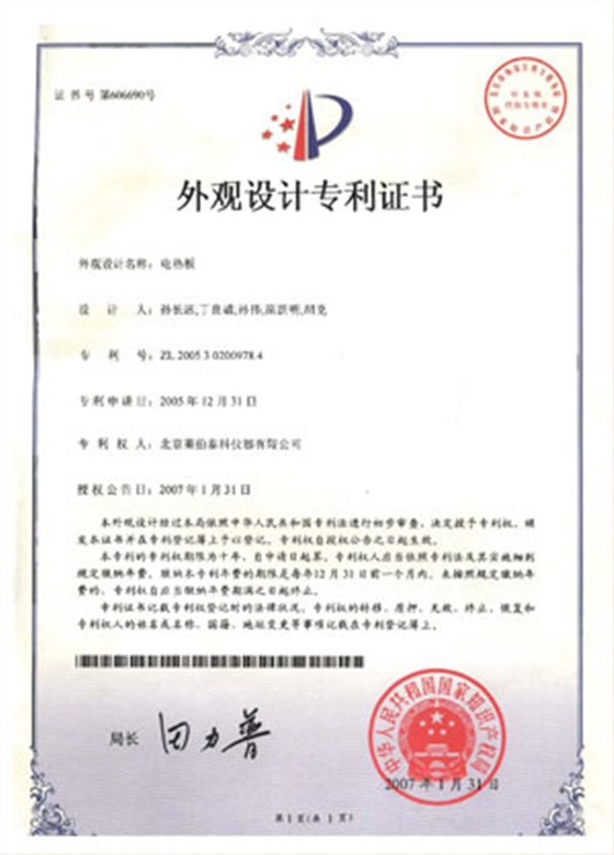 LabTech的电热板EH及EG系列均拥有:实用新型专利(专利号:ZL 2010 2 0174213.3); 实用新型专利(专利号:ZL 2005 2 0200914.9);外观设计专利(专利号:ZL 2005 3 0200978.4)